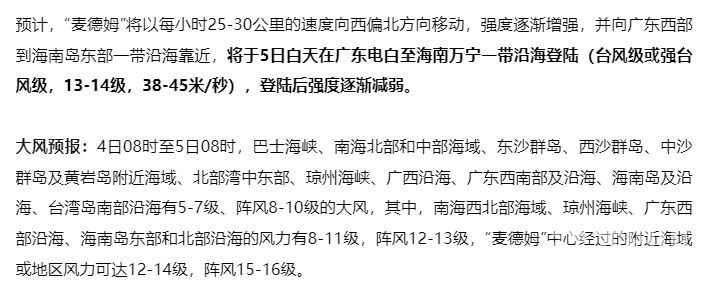 此外,据湛江市交通运输局消息,受台风影响,徐闻港、海安新港、粤海铁路北港或将于4日至6日停运(具体时间视气象情况而定)。