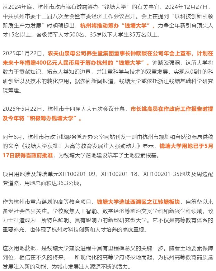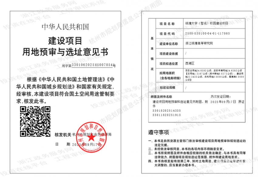 近日,杭州市规划和自然资源局发布钱塘大学(暂名)校园建设项目的建设项目选址意见书和用地预审。此举标明,钱塘大学的选址和总用地面积已基本明确,整体建设工作将步入新阶段。