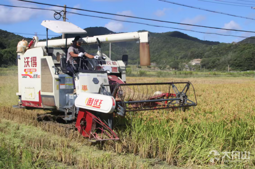 大岙绿盛农业有限公司正在收割单季稻谷