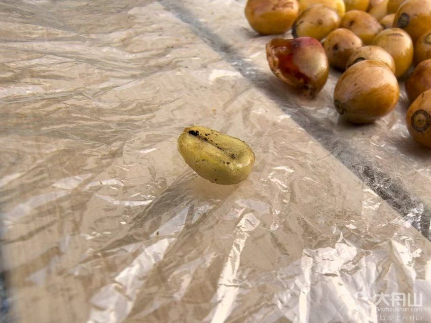 记者剥开一颗咖啡果,里面露出淡黄色的果肉,再扒开内果皮,里面包着薄皮的种子,这个种子就是作为咖啡原料的生豆。据了解,咖啡树一般是分批开花,果实也是分批成熟。这些天,俞佳逸等人隔三岔五来果园观察咖啡果成熟情况。俞佳逸告诉记者,果实表皮呈黄褐色就基本达到了可采摘的阶段。