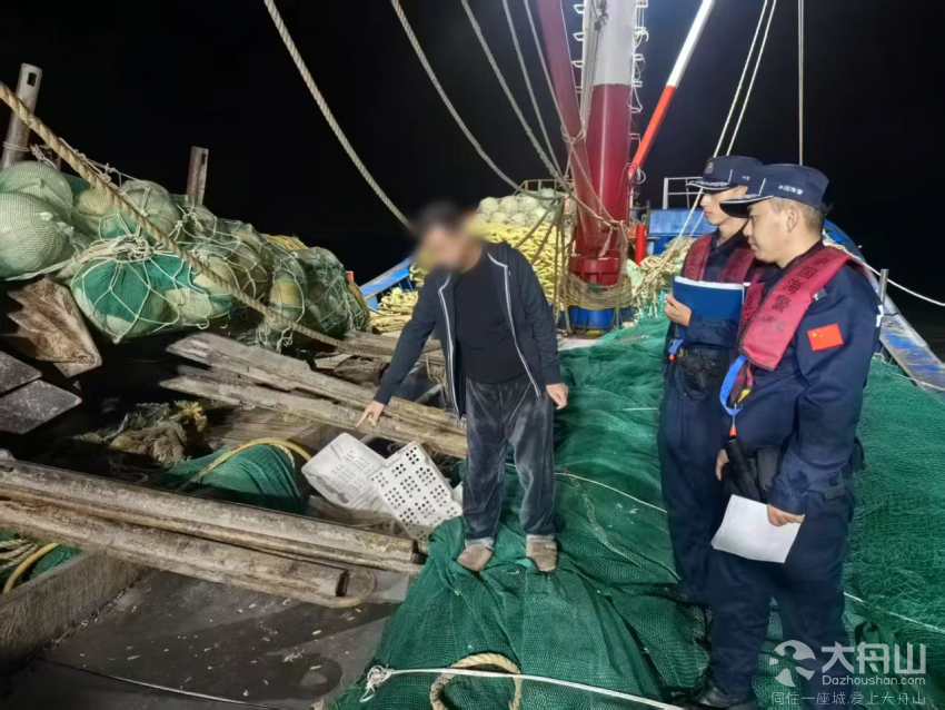 日前,舟山海警局在普陀莲花洋北侧海域查获1艘涉嫌非法捕捞渔船,查获涉案人员15人,查扣非法渔获物24万余斤。
